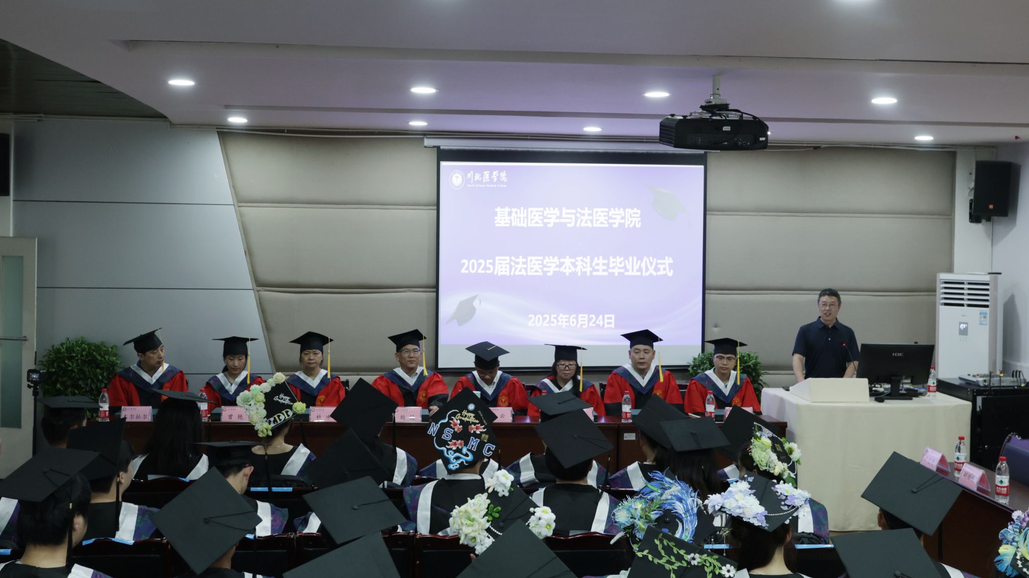 仪式在全体师生齐唱校歌中拉开帷幕。熟悉的旋律响起,悠扬的歌声回荡在会场,承载着同学们对母校的眷恋与热爱,也凝聚着他们对未来的憧憬与期待。随后,学院领导为获得省级优秀大学毕业生荣誉的同学颁发证书,这份荣誉不仅是对个人努力的认可,更是学院人才培养成果的生动体现,激励着在场的每一位学子。本科毕业生代表郭天齐走上发言席,用真挚的话语回顾了在学院学习生活的点点滴滴。从课堂上的专注听讲,到实验室里的反复钻研;从与老师的探讨交流,到和同学的携手成长,每一段回忆都饱含深情。他们向辛勤培育的老师表达感恩,向朝夕相处的同窗送上祝福,同时也分享了对未来的规划与决心,展现出毕业生们的责任与担当。在校生代表吴洪林带着满满的诚意与祝福走上台前,为即将踏上新征程的学长学姐们送上美好的祝愿,他表示,将以毕业生为榜样,努力学习专业知识,传承学院的优良学风,在未来的道路上奋勇前行。现场温情满满,传递着一届又一届学子间的深厚情谊。法医专业老师们饱含深情地为毕业生送上祝福,以朴实而温暖的话语叮嘱毕业生们在未来的工作和生活中,要坚守职业道德,不断提升专业素养,将法医精神发扬光大,在各自的岗位上发光发热。