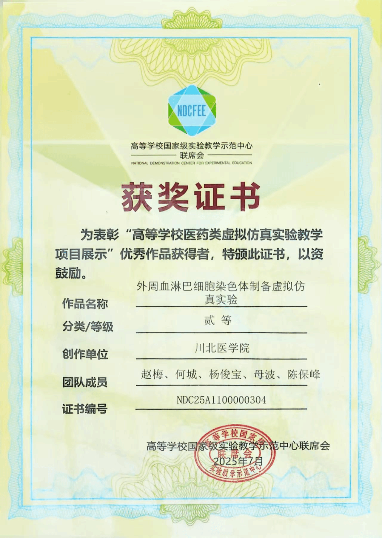 2025年7月27-30日,在贵阳举行的第十七届全国医学类实验教学研讨会上,我院细胞生物学与遗传学教研室团队主持的虚拟仿真实验教学项目《外周血淋巴细胞染色体制备虚拟仿真实验》从众多参赛作品中脱颖而出,荣获“高等学校医药类虚拟仿真实验教学项目作品展示”全国二等奖。
