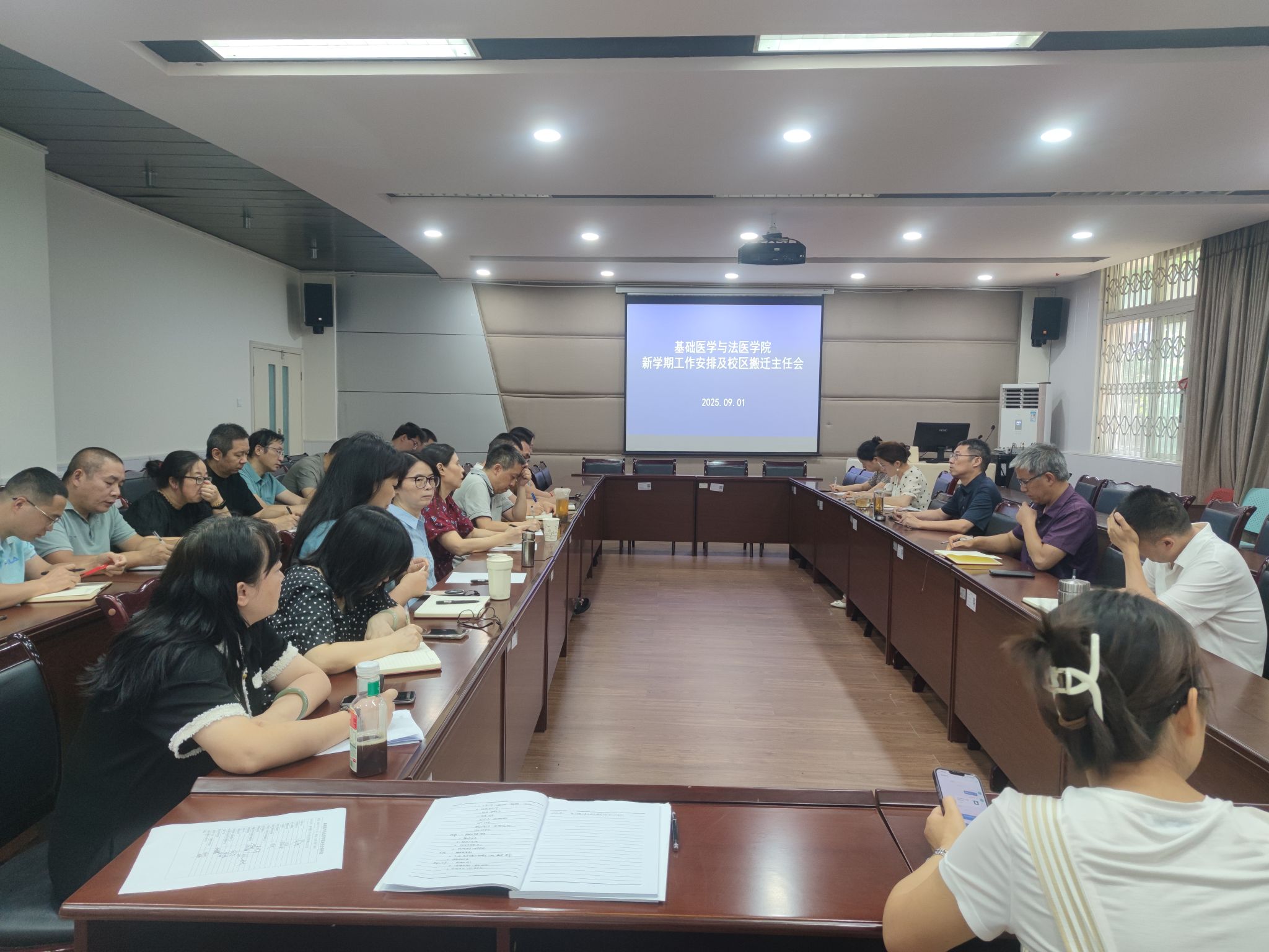 9月1日上午,基础医学与法医学院在部门学术厅组织召开新学期开学及学院搬迁主任工作会。学院班子成员、各科室主任参会,会议由杨健院长主持。