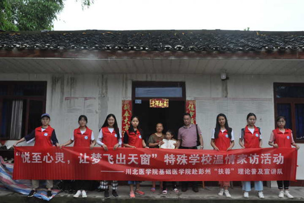 每个孩子都是上帝派来人间的天使。为了让特校孩子们感受到爱的力量,助力这些“折翼”天使们拥有更加积极向上的生活态度,基础医学院赴“彭州”扶蓉理论普及宣讲队于7月15日上午在在彭州各乡镇开展了以“悦至心灵,让梦飞出天窗”为主题的关爱特校儿童活动。