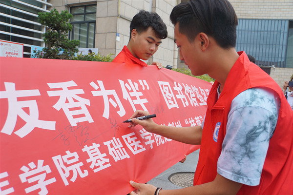 在开展“爱阅读”主题签名承诺活动环节,队员们更是热情高涨,积极主动配合图书馆工作人员和后勤组的准备工作。在阅读分享环节,志愿者们不时提出各种问题,同时还向读者推荐《黄帝内经》,《伤寒论》等部分医学相关书籍,并积极与读者展开交流探讨。在活动结束时,指导老师曹弟勇在横幅上签名并写下“在最美的年纪,为最真的梦想,走进图书馆,让我们一起成长! ”队员们也纷纷签上自己的名字,这是除了医学生誓言的第二份誓言,是志愿者们在用实际行动表明坚持好读书、读好书的决心。