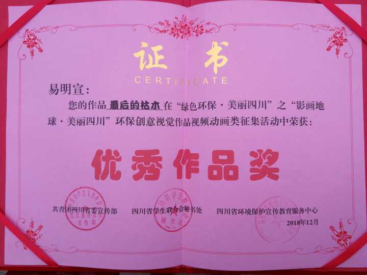 为深入学习贯彻党的十九大精神和省委十一届三次全会精神,增强全省广大青少年的环保意识,引导青少年有力投身打赢“污染防治”攻坚战,团省委,四川省学生联合会、四川省环境保护宣传教育中心联合举办的“影画地球·美丽四川”公益环保征集活动于12月5日在成都举行了颁奖典礼,我校基础医学院2018级临床医学专业易明宣同学获得优秀作品奖。