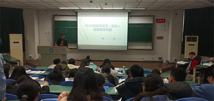 诚信是中华传统美德,也是社会主义核心价值观的重要内容。为加强学生诚信意识,12月27日上午,基础医学院2018级在图信楼207教室举办临床医学(定向)诚信教育专题讲座。讲座由基础医学院2018级辅导员杜瑞峰主讲,2018级临床医学本科(定向)100余名同学聆听了讲座。