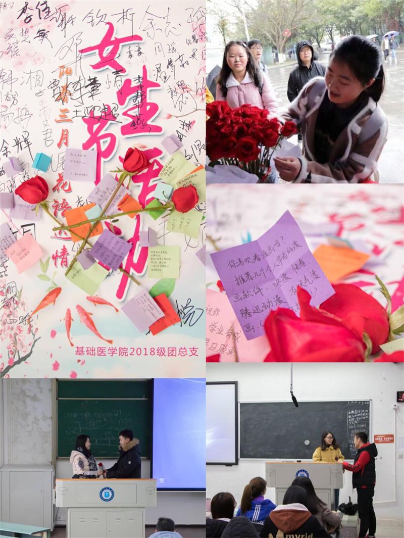 阳春三月,草长莺飞,迎来了一年一度的“三八”妇女节活动,为营造校园文化氛围,为女教师、女同学创造一个轻松温馨的大学校园环境,使广大女同胞获得更多的关注,基础医学院2018级团总支开展了 “阳春三月,花语达情”为主题的送鲜花送祝福活动。