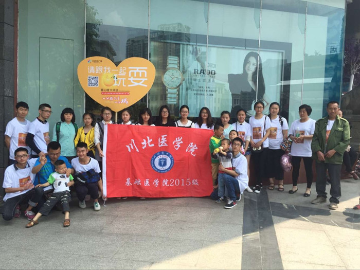 5月2日上午,基础医学院2015级学生自愿者们与南充儿童心理行为康复中心和川北医学院爱心社团以及王府井共同携手,在南充市北湖公园、五星花园、1227购物广场等多地同时开展了“一个橙改变一个城”的大型公益活动。