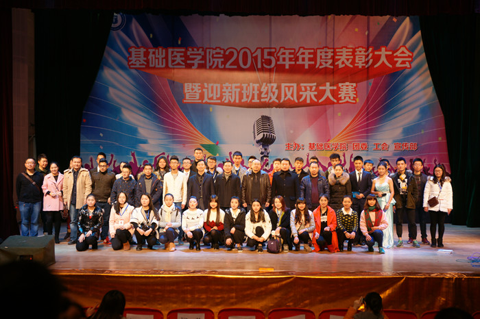 12月20日下午,世纪礼堂里人海如潮、流光溢彩,基础医学院2015年年度表彰大会暨迎新班级风采大赛在此正式拉开帷幕,学院党委宣传部、工会、学生处、校团委和各总支负责人应邀出席。