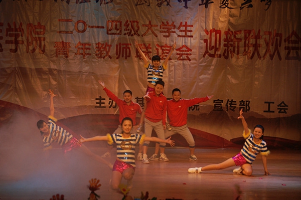 联欢会初始,按惯例,基础医学院对2014年度的优秀个人和优秀集体进行了表彰,基础医学院党总支副书记林锋主持了表彰大会。表彰大会后,一段活力四射的开场舞拉开了联欢会的帷幕。随即,党委副书记杜勇上台做了致辞,他提到开展迎新文艺会是让新生尽快融入大家庭,是搭建一个平台让师生展示才艺充实课余,他对青年教师联谊会成立一周年来的工作表示了肯定,也希望基础医学院继续师生联谊上下同心一道推动学校的整体发展。致辞后一共18个节目,由新生带来的音乐剧《你好,大学》将新生对大学的梦想和激情表现得淋漓尽致;《舞蹈与走秀》展现了学生会干部的青春风貌和团队合作;情景剧《甄嬛歪传》诙谐幽默,展现了新生报到学生会招新等多姿多彩的校园生活;体育教研室赵通足、童国军教师和他的学生团队带来刚柔并济的武术表演赢得连连叫好;年级办辅导员带来的《健美操》激情无限;老师们带来的对唱《为了谁》、《爱的供养》及小合唱《让世界充满爱》更是掀起了阵阵高潮。这次联欢会由基础医学院党总支策划和承办,得到了宣传部和工会的支持,气氛十分热烈,大约持续了100分钟,最后在师生合影中圆满的拉下帷幕!