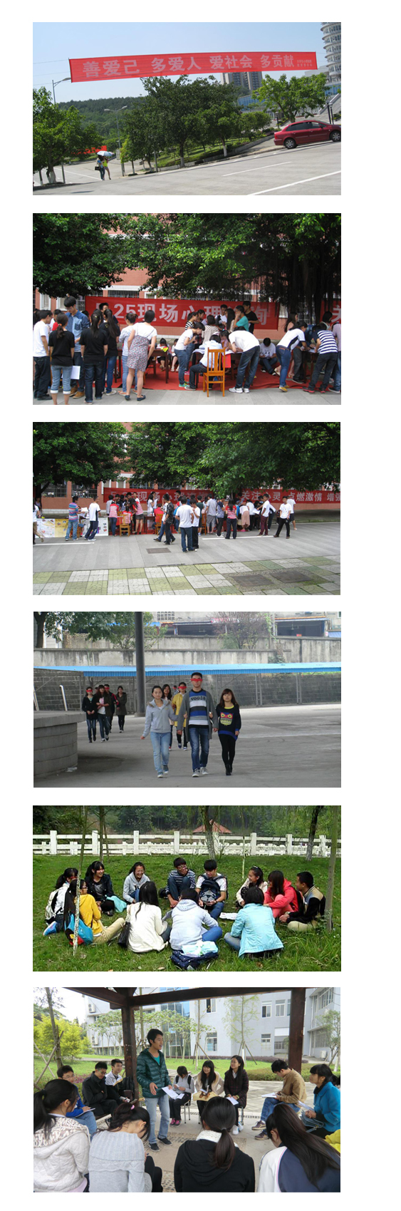 3、关注班级、宿舍,开展心理健康教育活动。自2003年来,我校在每个小班设立心理咨询员,并对班心理咨询员和寝室室长、楼层层长等骨干进行心理健康知识培训,确保有心理问题的同学能被早发现,早干预。同时每学期不定期举办有关心理健康方面的主题班、团会,增强同学们接受心理健康教育的意识。