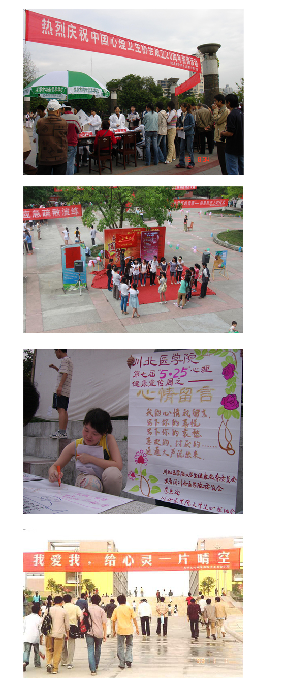 4、指导心理协会,拓宽心理健康教育途径。自1998年成立大学生心理卫生协会以来,在校内外开展了各类心理健康教育活动,吸引了广大同学的参与,学生在活动中行为互动,心灵得到沟通,人格得到完善,品行得到升华,生活得到充实,潜能得到发挥,促进了协会的不断发展和壮大,于2005年荣获“四川省高校明星社团”。