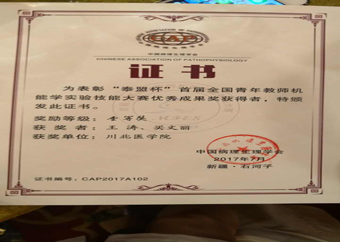 会上,中国病理生理学会机能实验教学工作委员会主任、温州医科大学基础医学院院长龚永生作了题为《机能实验教学改革的昨天、今天和明天》的专题报告,南方医科大学董为老师展示了与上海萧迪生物科技有限公司最新联合开发的“基于混合式教+学模式的感染与免疫模块在线(移动)课程”—行知医苑,哈尔滨医科大学金宏波教授解读了《全国高等医学实验机能学教学课程建设标准》。在随后进行的首届“泰盟杯”全国青年教师机能学实验技能大赛中,我校教师王涛和买文丽、刘露和霍雯参加了比赛,并分别获得大赛家兔组“一等奖”和大鼠组“三等奖”。