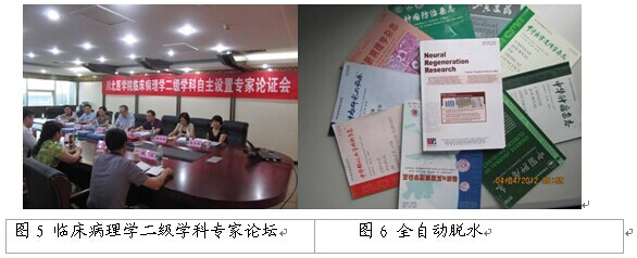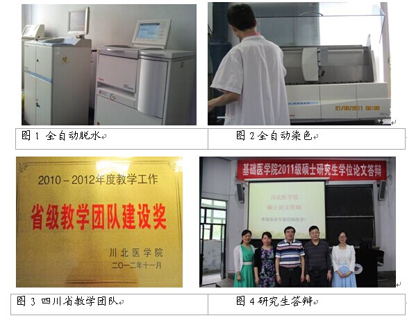 同时,该学科点拥有分子生物研究所、病理教研室及医院病理科等较好的科研平台,该平台仪器设备先进,拥有进口生物组织切片机、恒温冷冻切片机、全自动组织脱水机(图1)、全自动染色机(HE和免疫组化)(图2)、荧光显微镜、生物显微镜、彩色图文摄影分析系统、原位杂交仪、PCR仪、凝胶成像系统、CO2培养箱、基因分析仪等。能够完成组织和细胞的常规制片技术、免疫组织化学技术、荧光原位杂交(FISH)技术、特殊染色技术、基因分析等,为教学、科研、临床搭建了较高的服务平台。