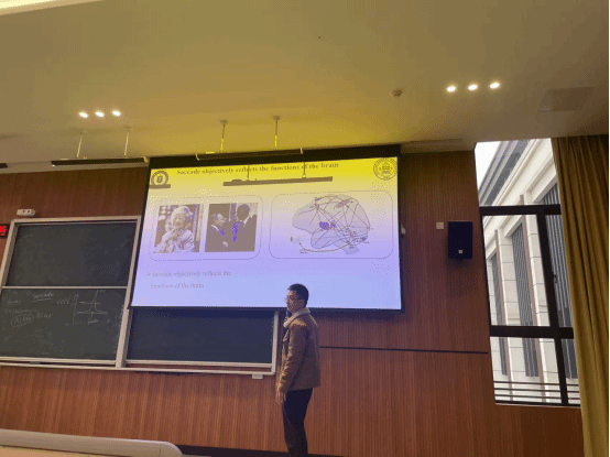 课程伊始,马文博老师通过视频现场演示,介绍了“视觉-眼跳”的重要性及其背后的神经机制,引导留学生在跨学科语境下快速构建心理学与认知神经科学的知识框架。作为课程设计的核心实践环节,马博士重点介绍了团队原创性研究成果——“多步眼跳”在帕金森病早期鉴别诊断中的突破性价值。通过回顾性研究数据的分析展示,学生们直观理解了眼跳参数作为生物标志物的显著区分度,及其相较于传统量表的灵敏度与特异度优势,体现了课程强调的“基于证据的临床决策”理念。为强化“做中学”的课程目标,马文博老师现场播放了眼跳实验全流程视频,并邀请部分学生进行简易体验。将抽象的科研流程转化为具象的课堂互动,引发了全场的热烈反响。这种沉浸式教学设计,正是学院创新课程中“技术体验模块”的重要实践。