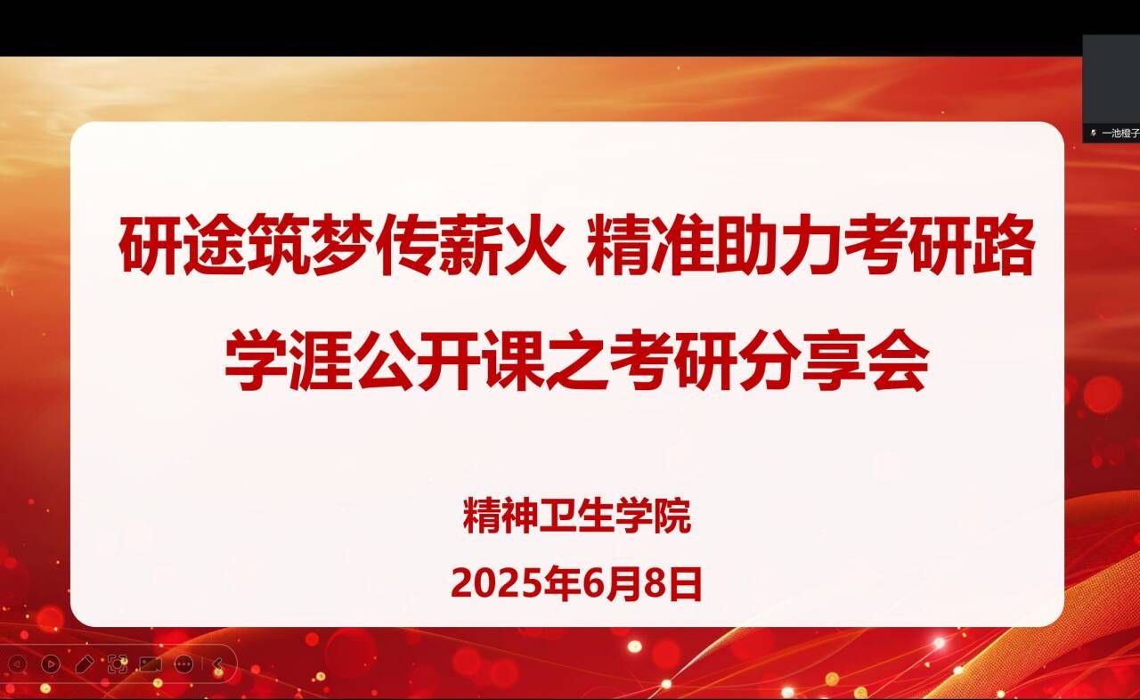为充分发挥优秀学子的示范引领作用,助力学生科学规划考研路径,6 月 8 日晚,精神卫生学院通过腾讯会议平台成功举办了“学涯公开课之考研分享会”。本次活动以“研途筑梦传薪火,精准助力考研路”为主题,面向 2021 级精神医学专业全体学生,旨在通过优秀毕业生的经验分享,为备考学子提供专业指导。