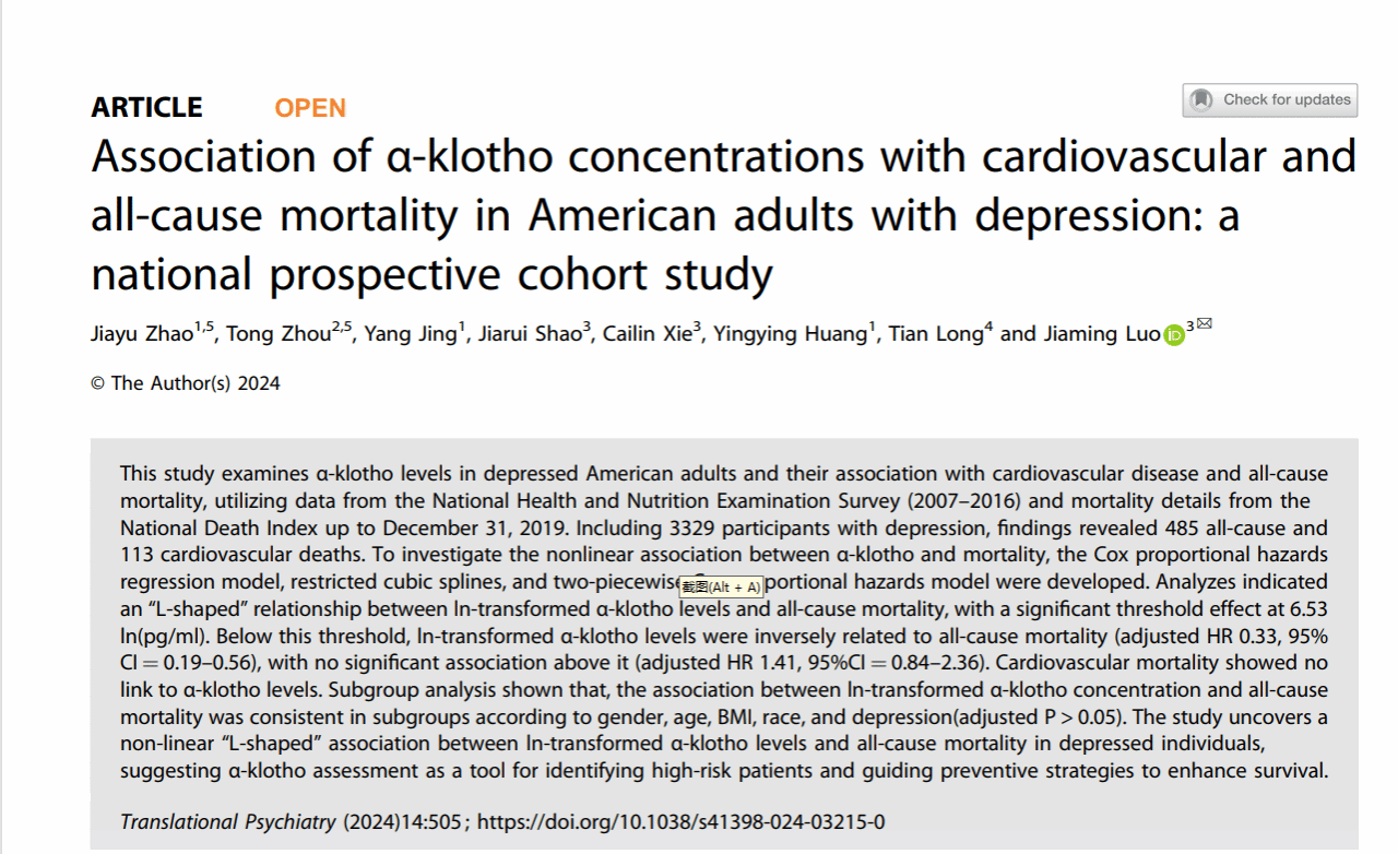 近日,我校精神卫生学院罗家明教授课题组在中科院精神卫生领域1区TOP期刊《Translational Psychiatry》上发表了题为“Association of α-klotho concentrations with cardiovascular and all-cause mortality in American adults with depression: a national prospective cohort study”的研究论文。罗家明教授为论文的通讯作者,研究生赵佳玉为第一作者。