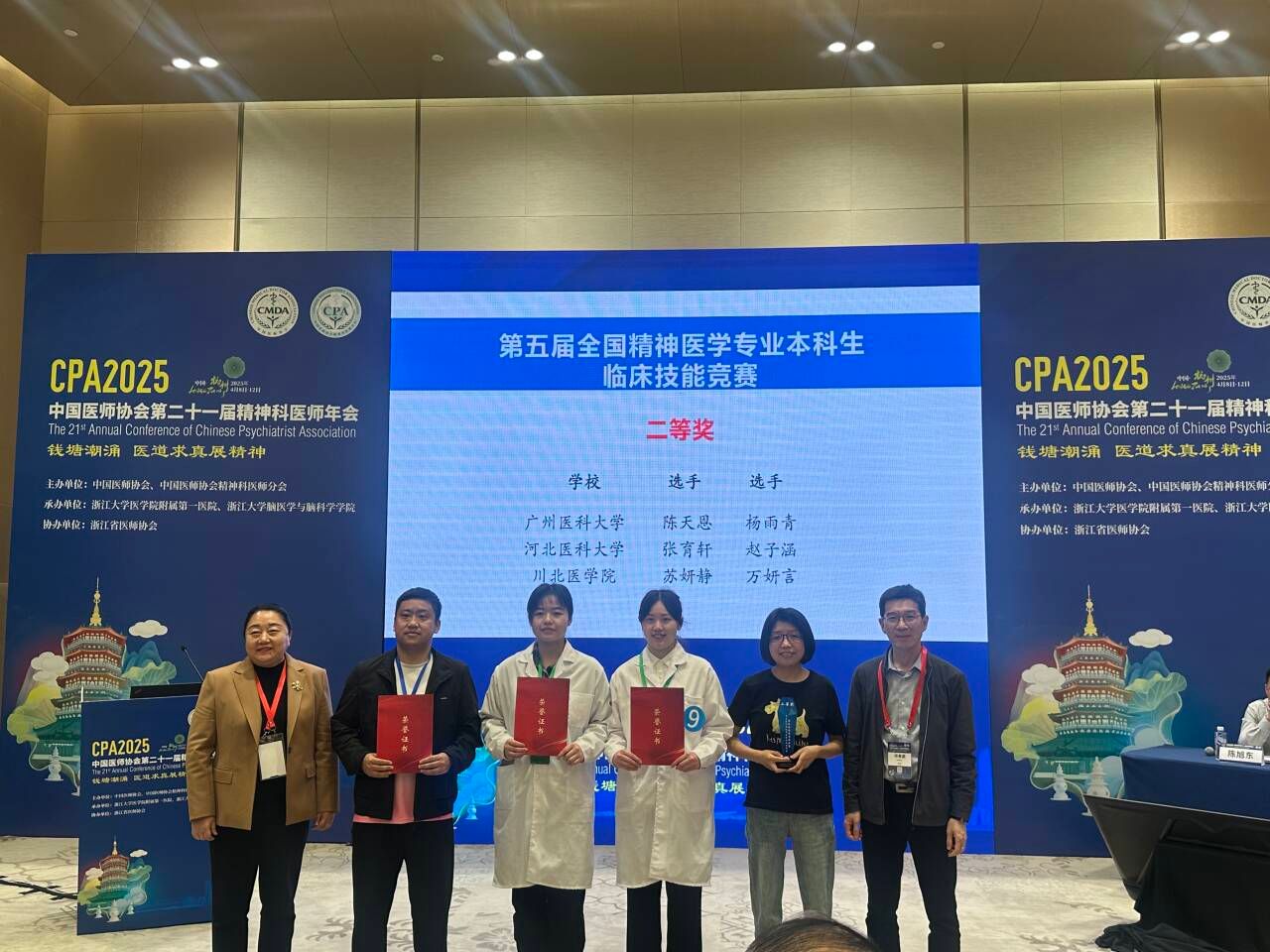 4月9日到10日,第五届全国精神医学专业本科生临床技能竞赛决赛在浙江杭州举行。本届大赛分为初赛和决赛两个赛程,全国开设精神医学专业的高校代表队参赛。川北医学院精神卫生学院2021级苏妍静、万妍言组成的代表队以初赛第4名成绩挺进决赛,经过激烈角逐,在决赛中取得二等奖的优异成绩。