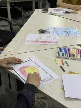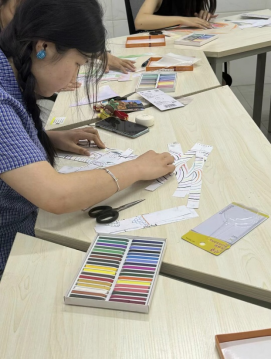 周欣老师首先引导同学们进行放松练习,回想最近发生的不开心的事情,感受自己的负面情绪,然后用粉笔在纸上通过颜色、图案、线条来表达自己的情绪。接着又引导大家用同样的方式回想和描绘正面情绪。之后,周欣老师组织同学们把画纸剪成条,并编制成一幅新的画。最后周老师邀请同学分享自己在绘画和编织中的体会,再总结情绪的认识与管理方法,并鼓励同学们用情绪编织的方法在今后的学习和生活中去感受、表达、接纳和调节自己的情绪。