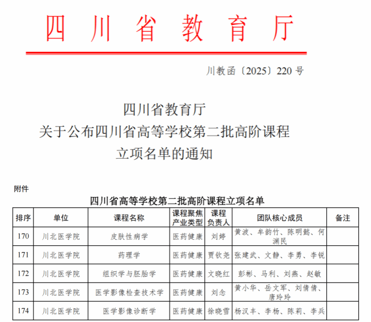 7月16日,四川省教育厅发布《四川省教育厅关于公布四川省高等学校第二批高阶课程立项名单的通知》(川教函〔2025〕220号),我校临床医学院·附属医院《皮肤性病学》、药学院《药理学》、基础医学与法医学院《组织学与胚胎学》、医学影像学院《医学影像检查技术学》《医学影像诊断学》5门课程立项四川省高等学校第二批高阶课程。