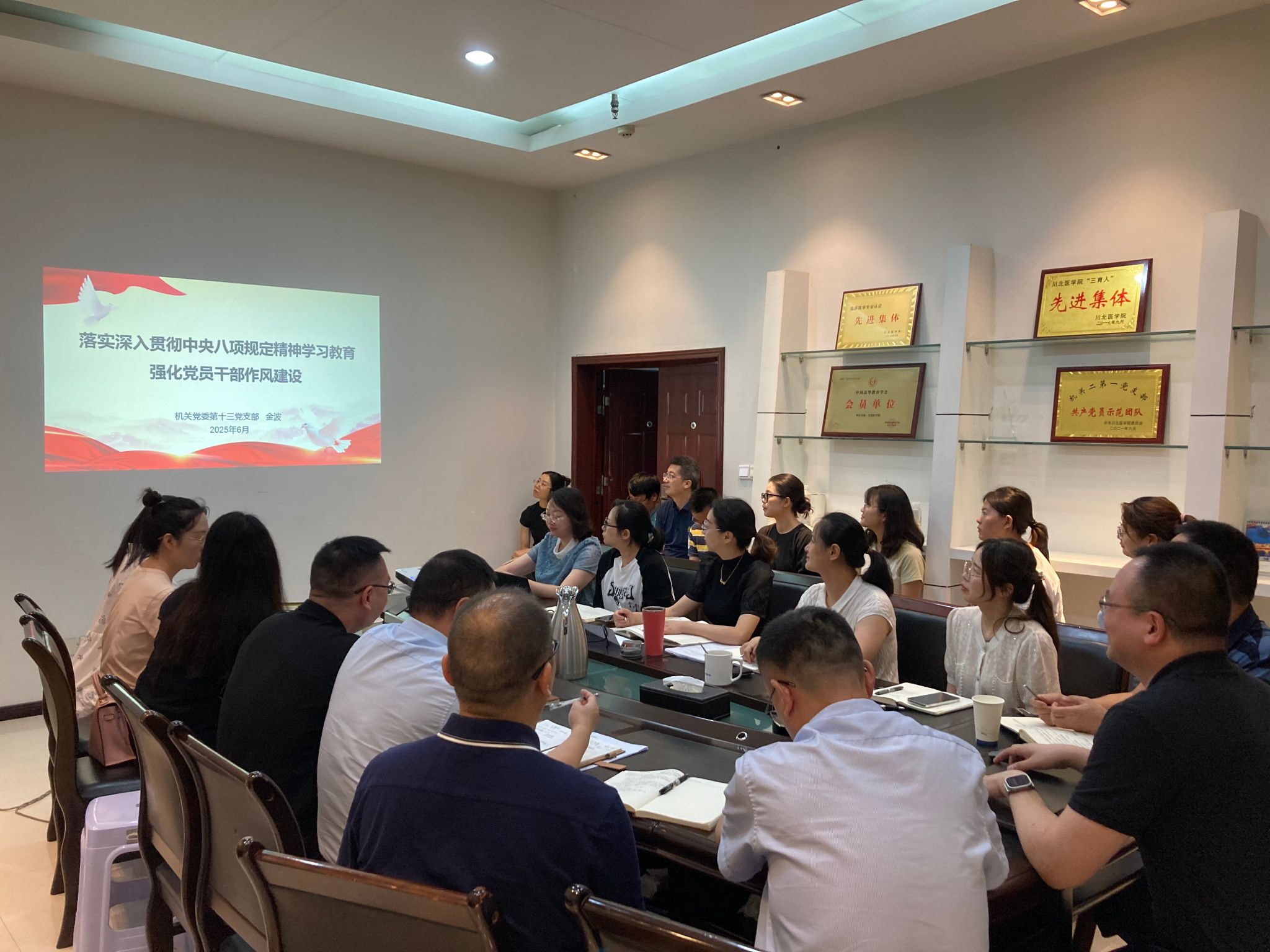 为持续深入推进作风建设,强化党员干部纪律规矩意识,在党的生日“七一”前夕,2025年6月30日,机关党委第十三党支部组织全体党员召开主题党课。党支部书记金波同志以“落实深入贯彻中央八项规定精神学习教育,强化党员干部作风建设”为题,为教务处、创新创业学院全体党员及副科级以上干部讲授了一堂深刻而生动的党课。