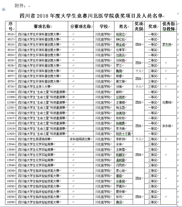 根据《四川省教育厅关于公布2018年省级大学生竞赛项目获奖名单的通知》(川教函[2019] 2号),我校祝荣芯等33位同学在各竞赛单元表现优异分别荣获团体及个人一、二、三等奖;罗杰伟、任勇刚、宋永砚三位老师荣获2018年度四川省大学生竞赛优秀指导教师称号。具体获奖内容见附件:四川省2018年度大学生竞赛川北医学院获奖项目及人员名单。