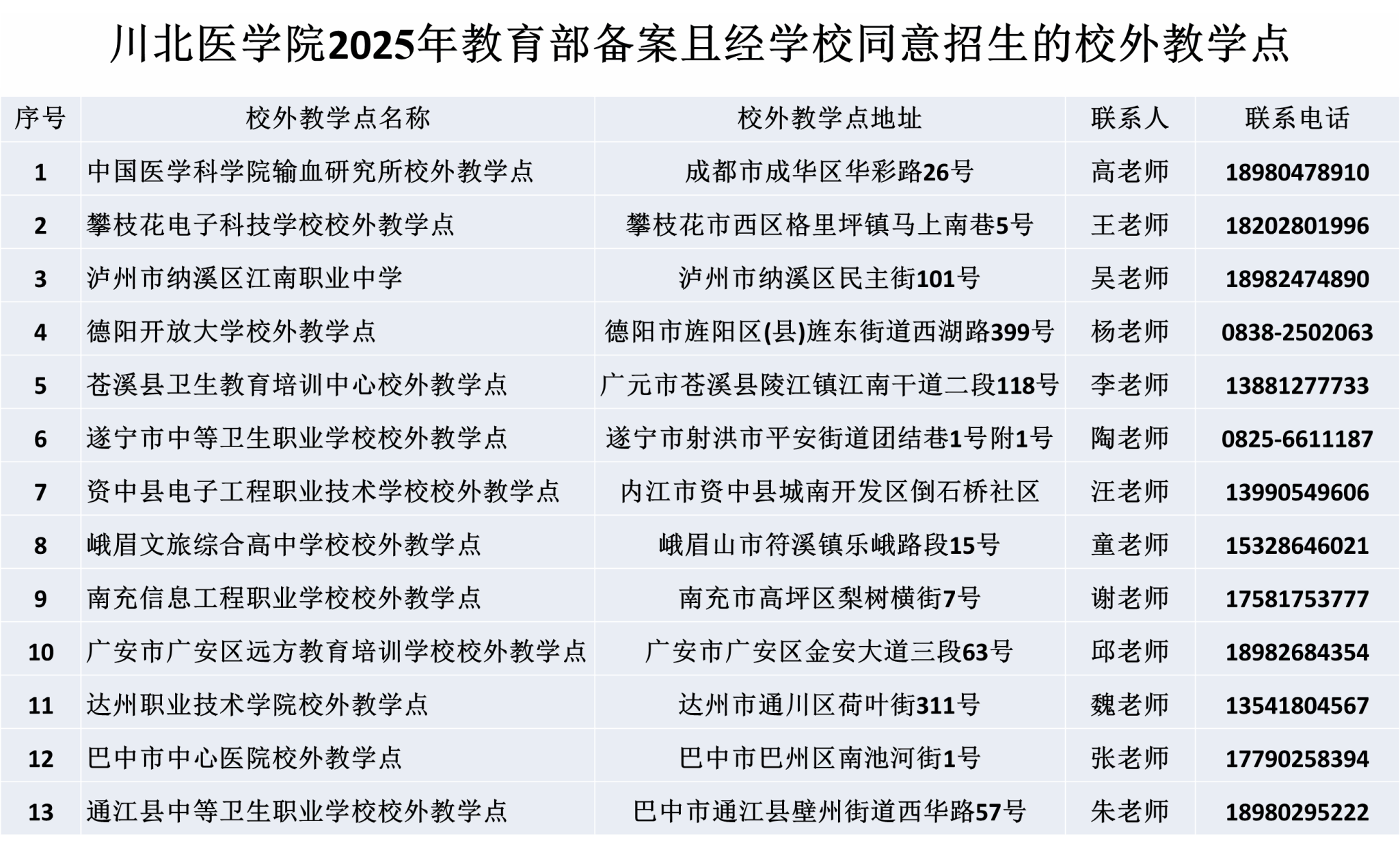 川北医学院高等学历继续教育2025年教育部备案且经学校同意招生的校外教学点