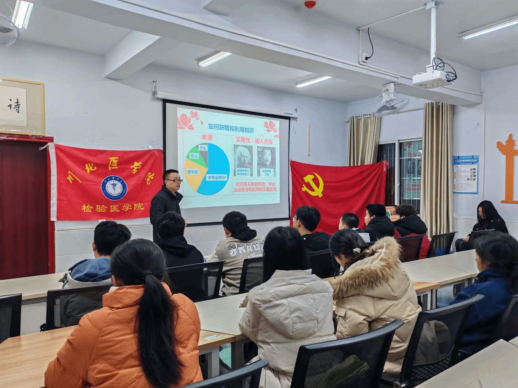 为切实发挥党建工作在检验医学“三全育人”体系中的引领作用,搭建创新人才培育新平台,探索独具专业特色的党建驱动学生成长成材之路。2025年3月17日,检验医学院党总支依托“云聚红心”党建工作室,以“人非生而知之者,谁来解惑?——科学创新促进个人成长”为主题,成功举办“红检赋能”系列活动首场学术讲座,开启了党建与育人深度融合的新篇章。本次活动特邀检验医学院教工党支部书记、国家自然科学基金青年项目获得者贺洪飞博士担任主讲。检验医学院2023级、2024级部分学生参与了活动。