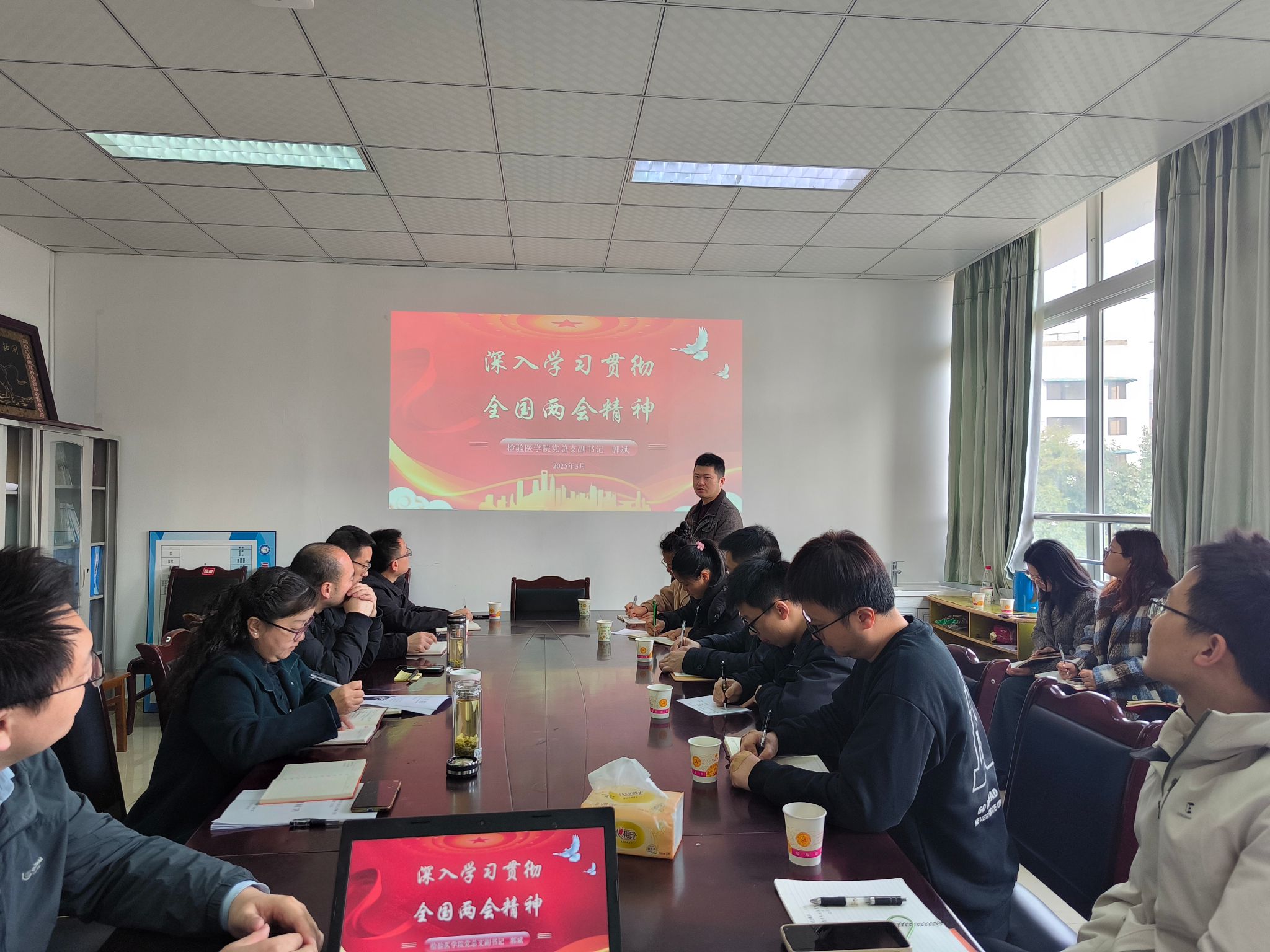 为深入学习贯彻全国“两会”精神,推动医学人才与科研、教学协同高质量发展。3月20日上午,检验医学院党总支理论学习中心组在检验医学院会议室召开2025年全国“两会”精神专题学习会议。检验医学院全体在岗教师党员参加学习,会议由检验医学院党总支副书记郭斌主持。