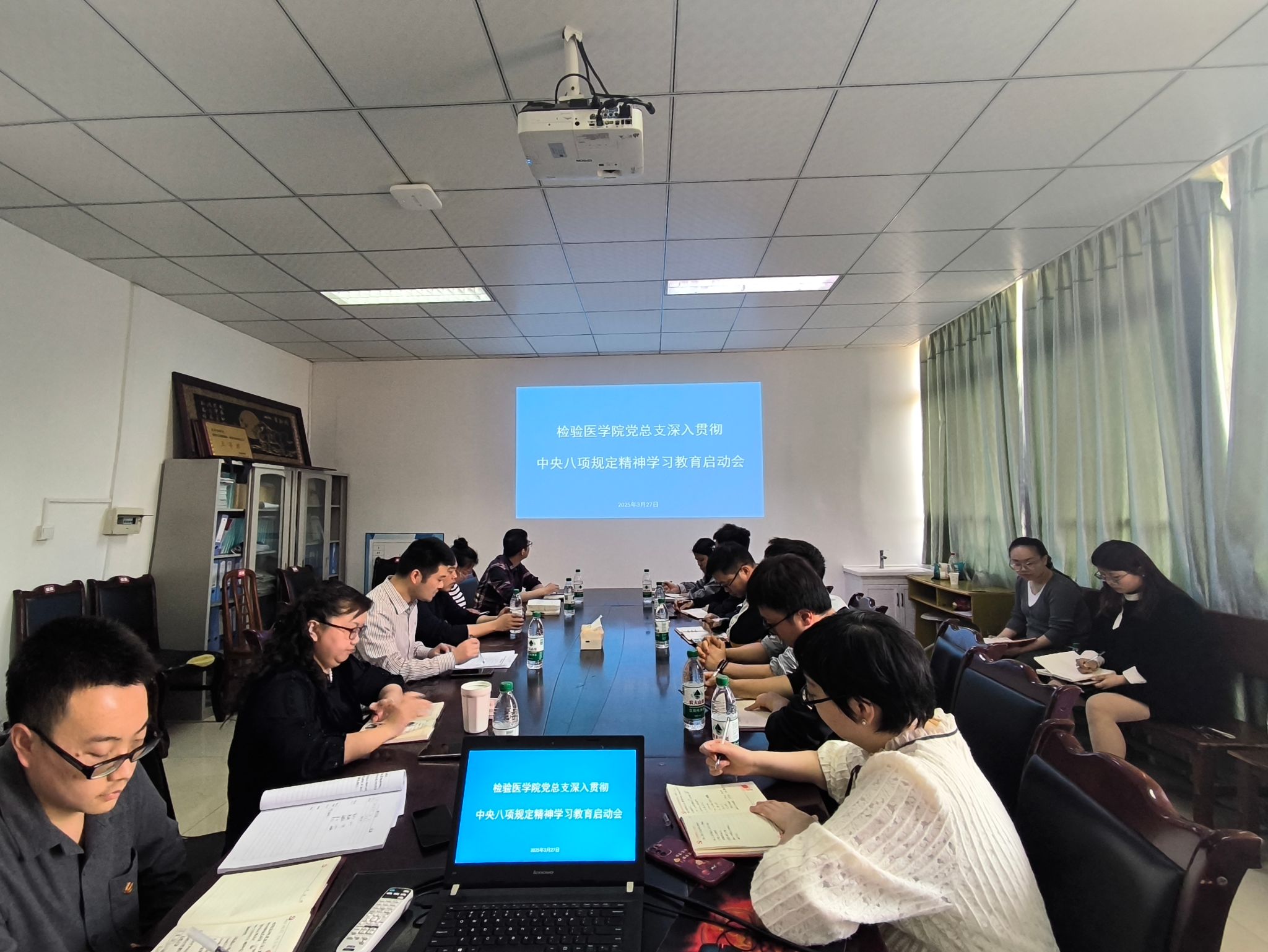 近日,检验医学院党总支在学院会议室召开深入贯彻中央八项规定精神学习教育启动会,学院全体在岗党员教师参会,会议由学院党总支副书记郭斌主持。