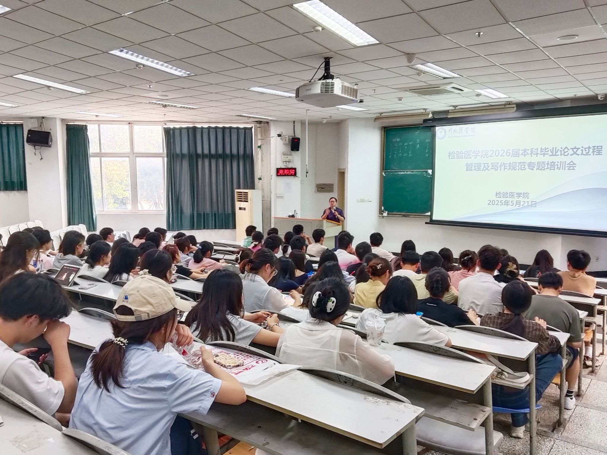 为帮助即将赴实习点的学生掌握学术规范,提升论文写作能力,为后续毕业论文环节做好充分准备,5月21日,检验医学院在顺庆校区一教201召开“医学检验技术专业本科毕业论文过程管理及写作规范专题培训会”,会议由学院副院长方莉主持并担任主讲,教务科、学生科相关教师及2022级医学检验技术专业全体本科生参加培训。