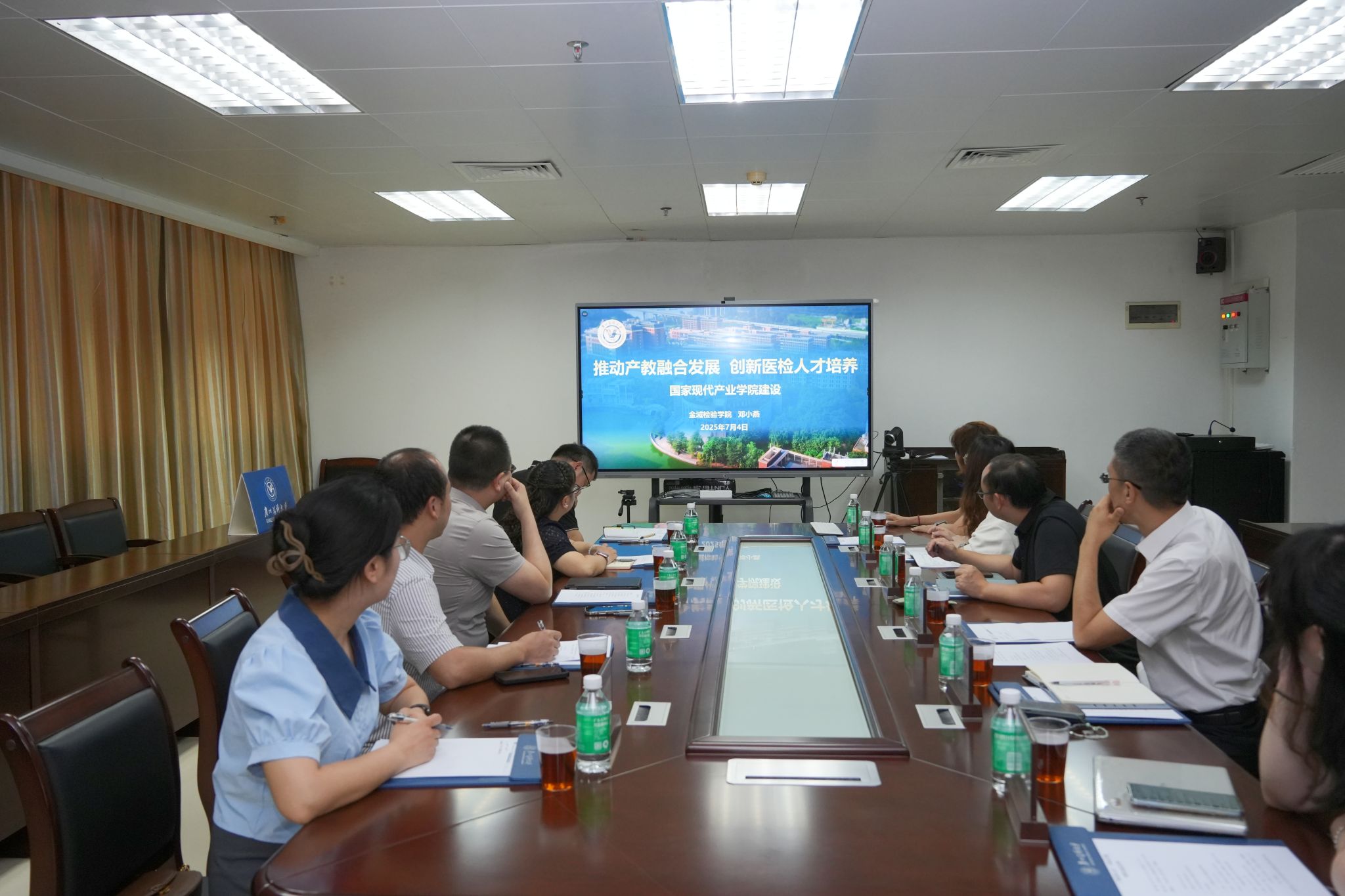 邓小燕详细介绍了国家级现代产业学院的建设历程,分享了广州医科大学金域检验学院以校企协同创新为抓手,通过深化产教融合,构建了“三领域、四核心、三融通”创新型人才培养新模式;通过持续推进课程改革,将行业最新技术融入教学实践新举措;通过着力打通科研成果转化通道,打造校企协同创新平台新体系的相关经验。交流团成员认真聆听并就关心的问题进行了深入探讨。