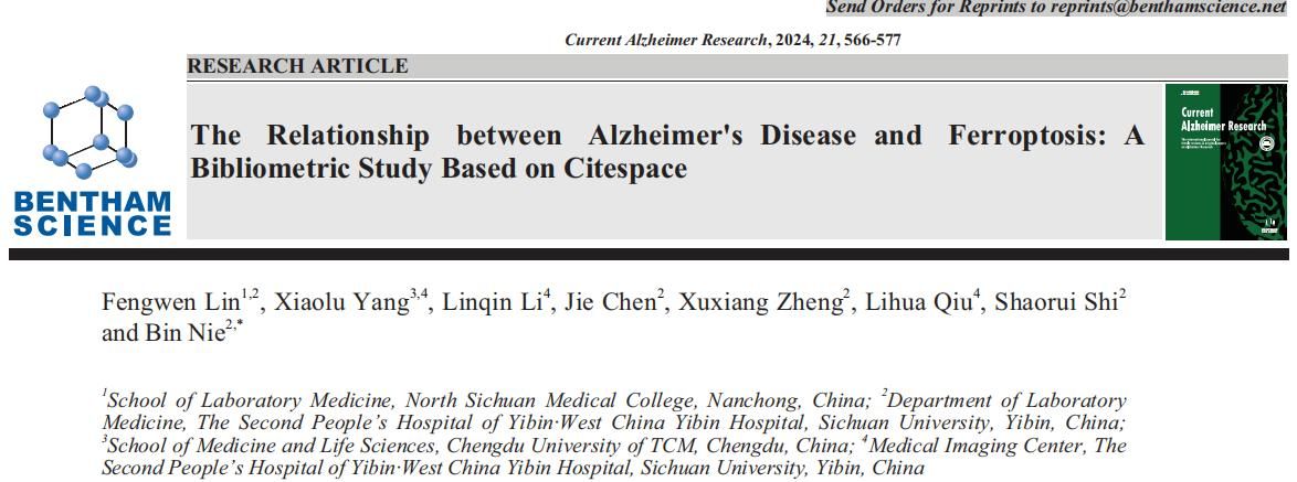 2024年12月23日,我院2023级临床检验诊断学硕士研究生林凤雯同学以第一作者在《Current Alzheimer Research》(中科院四区,IF=1.8)上发表了题为《The Relationship between Alzheimer's Disease and Ferroptosis: A Bibliometric Study Based on Citespace》的研究论文,导师聂滨教授为该论文的通讯作者。