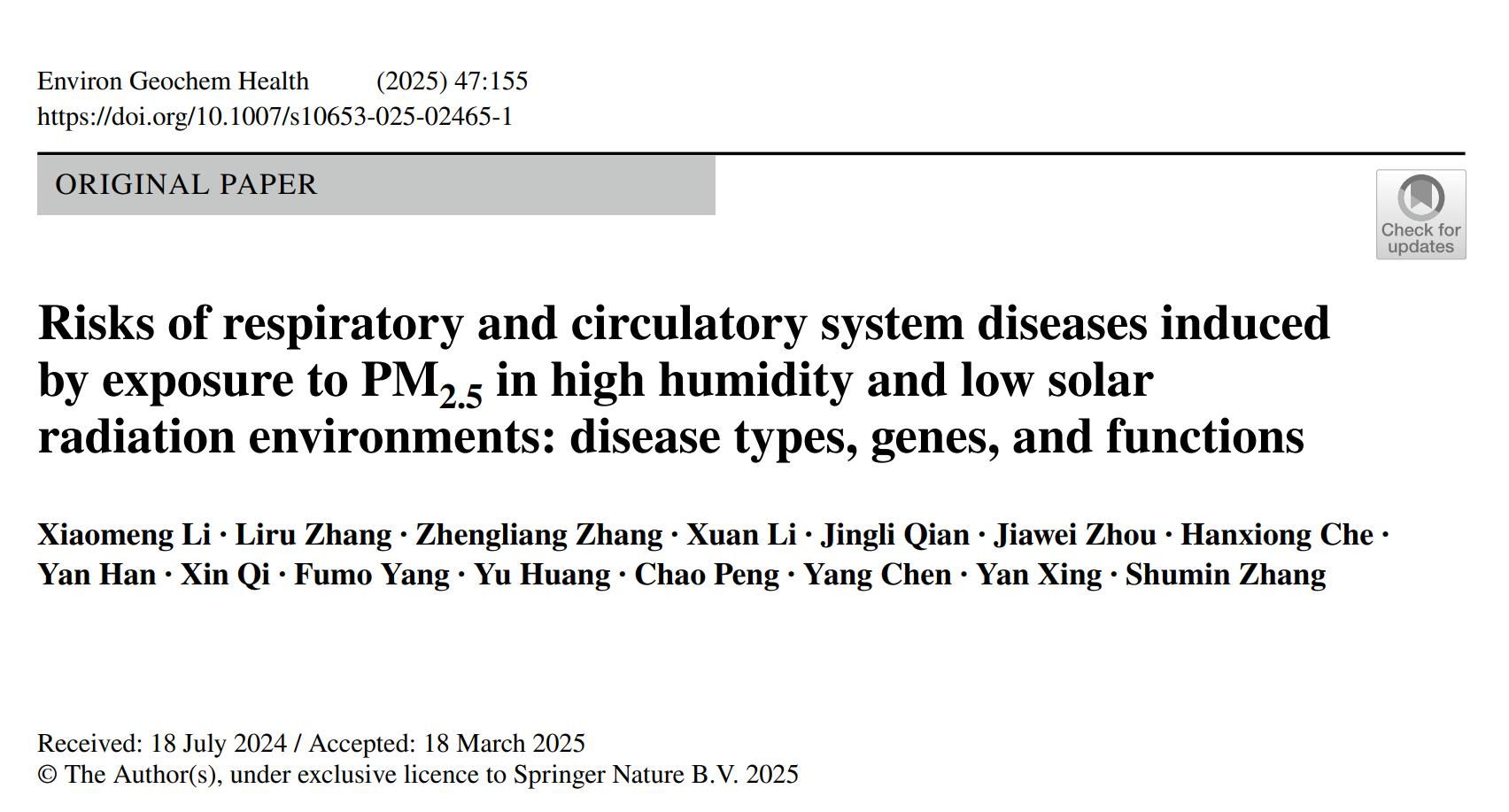 2025年3月18日,我院2022级医学技术硕士研究生李晓萌同学以第一作者在《Environmental Geochemistry and Health》(中科院四区,IF=3.2)上发表了题为《Risks of Respiratory and circulatory system diseases induced by exposure to PM2.5 in high humidity and low solar radiation environments: disease types, genes, and functions》的研究论文,导师邢艳教授和张蜀敏教授为该论文的通讯作者。