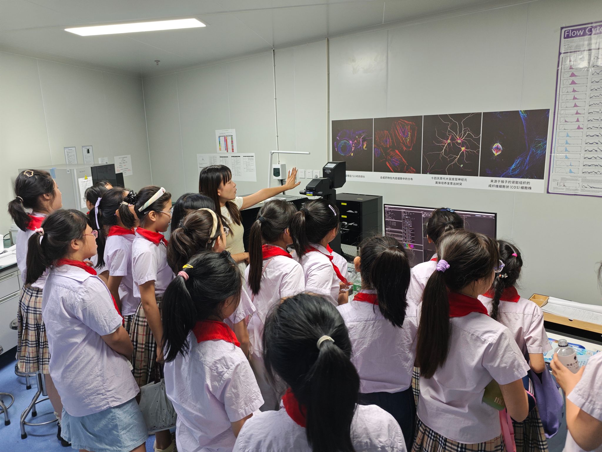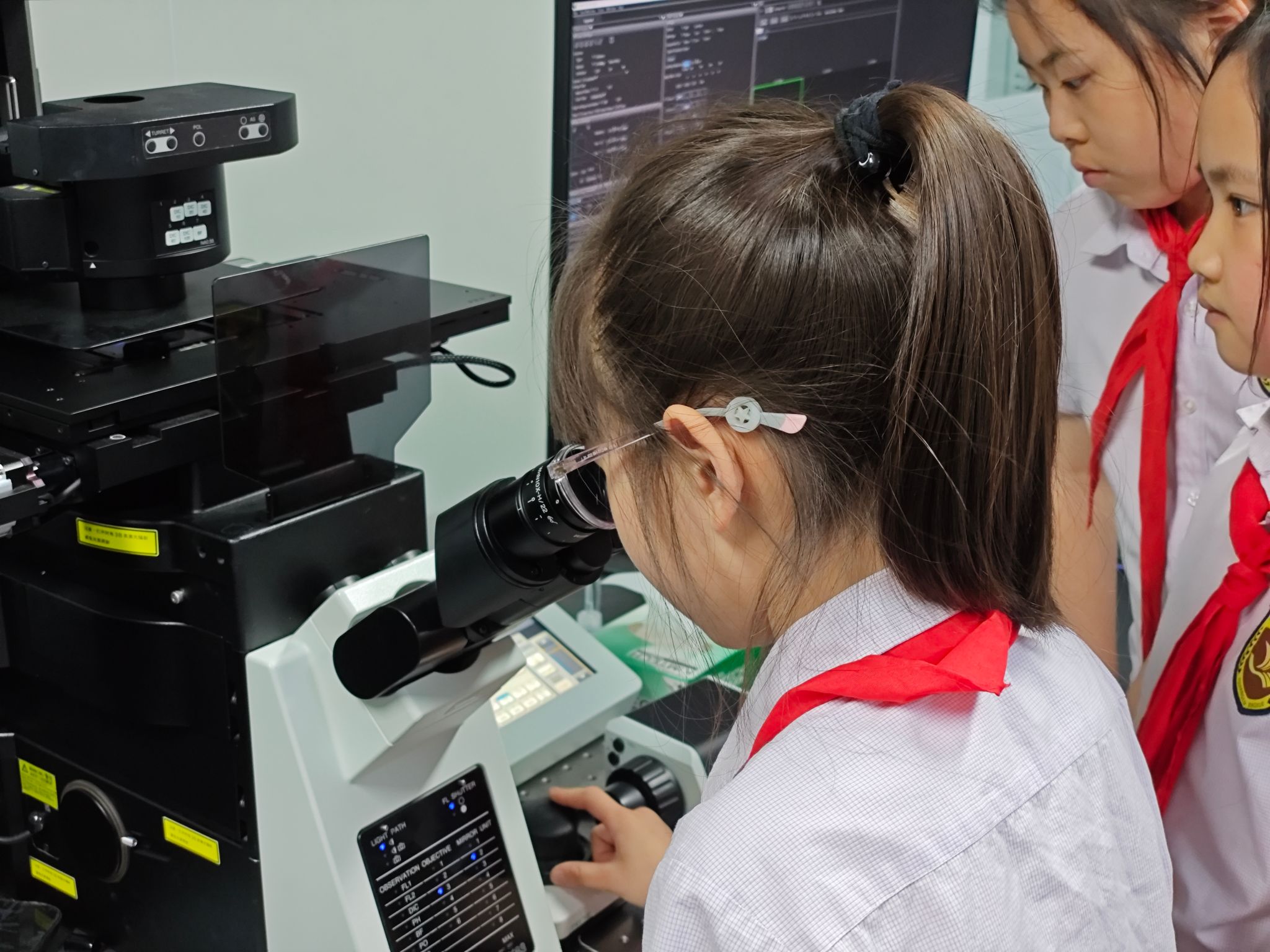 活动伊始,平台教师为小朋友开展了一场《探索生命的奇妙之旅-了解我们的身体和动植物从宏观到微观》科普小课堂,以生动有趣的形式为孩子们科普了生命微观世界。实验探索环节,在平台教师的指导下,小朋友第一次通过光学显微镜观察到了形态各异的微观世界:体节分明的蜜蜂、错落有致的百合花蕊、晶莹剔透的洋葱表皮细胞。看到激光共聚焦显微镜下荧光标记的“彩色”细胞时,孩子们发出了此起彼伏的惊叹声,直观地感受到生命科学的魅力。最后,平台教师带领小朋友参观分子生物学实验室,了解科研工作者的日常工作内容,激发了他们对科学的热情。