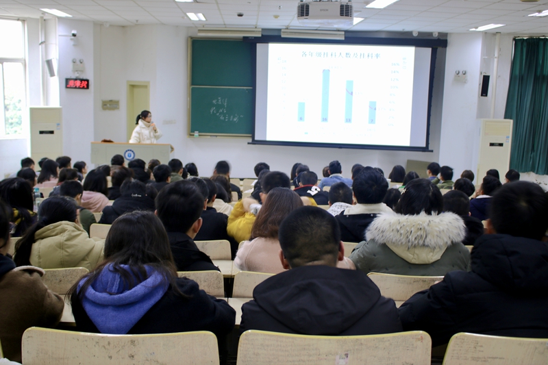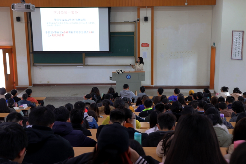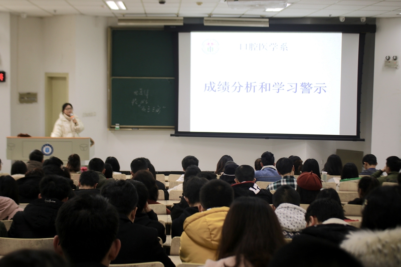 会议伊始,老师根据《口腔医学专业五年制本科人才培养方案》阐述了口腔医学专业大一至大四各年级课程类别以及学分分布情况,分析了各学年课程设置难度是由浅入深,知识内容环环相扣,告诫同学们务必认真学习基础理论与知识,为日后更高水平的学习与发展夯实基础。随后分别向同学们展示了各年级、班级的挂科人数及挂科率、各年级平均学分绩点分布情况及分数段走势对比图,用鲜明的数据、直观的对比给同学们敲响了警钟,同时也增强了同学们学习的危机感与年级、班级的荣誉与互助意识。最后着重强调了毕业证与学位证的获得条件,要求同学们端正学习态度,明确考试违纪对学位证的获取有一票否决的意识,培养自主学习能力、实践能力和创新精神,努力成为品德优良的应用型医学人才,做一个对自己、家庭、社会负责的新时代青年。