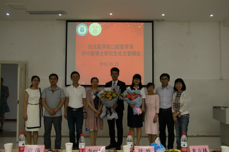 2018年5月25日下午,口腔医学系首届硕士研究生答辩会在口腔系实验室进行,参与答辩的硕士研究生为2015级硕士研究生马文强和马莹。答辩会由答辩主席四川省人民医院费伟教授主持,负责此次答辩的专家还有川北医学院米方林教授、刘英教授、母波副教授、青松副教授、李丽华副教授及学科答辩秘书朱万春副教授。口腔系全体研究生进行了观摩与学习。