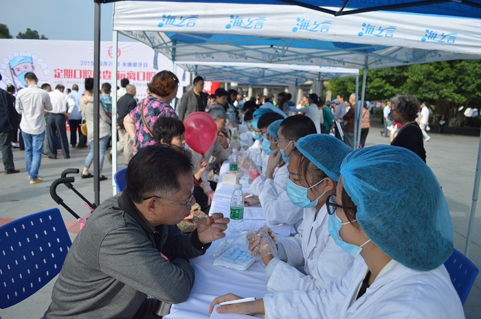 今年爱牙日的主题是“定期口腔检查,远离口腔疾病”。活动分为宣传口腔保健知识、问卷调查、免费义诊、测量血压、有奖问答五个部分。活动伊始,由口腔医学系20名志愿者表演的“快闪舞蹈表演”吸引了大量市民前来咨询,我校附属医院口腔门诊部的专家为前来咨询的市民做了免费口腔检查。