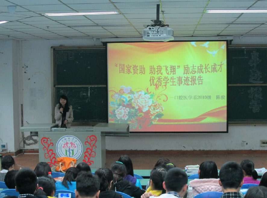 为进一步促进口腔医学系学生的全面发展,向优秀学习,2014年3月30日,口腔医学系举办“国家资助,助我飞翔”励志成长成才优秀学生事迹报告会,邀请获得励志成长成才优秀学生典型二等奖的口腔医学系2010级的陈俊作主题演讲。