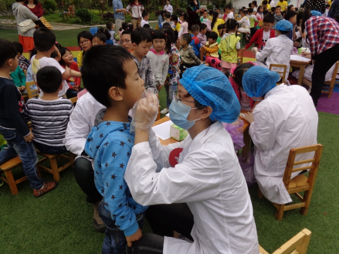 活动在《我要刷牙》和《洗手歌》的歌声中拉开了序幕。志愿者分工明确: 2011级志愿者耐心为小朋友检查牙齿,2012级志愿者负责填写儿童口腔调查问卷,2013级志愿者维持秩序同时教授小朋友们正确的刷牙和洗手方法。整个活动,井然有序充满欢声笑语。