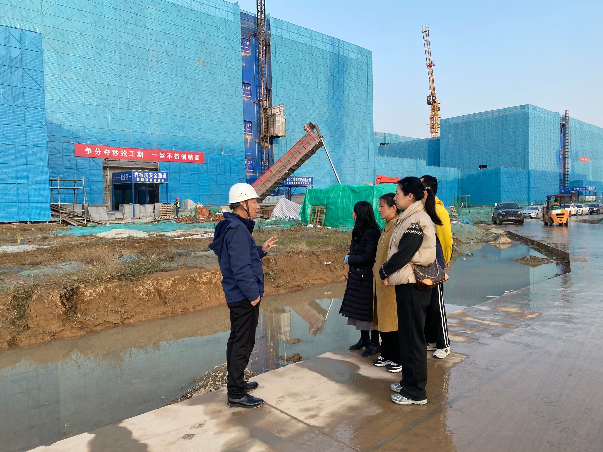 活动当日,天气晴好。会员们怀着激动与期待的心情来到新校区建设工地。现场,各类大型建筑机械有序作业,工人们忙碌的身影穿梭其中。推进办青宏彦老师为大家详细介绍了项目推进的整体情况,介绍了各区域的功能布局、设计理念以及施工进度安排,并带领大家参观了留学生公寓、学生公寓等。参观过程中,大家不时提问,就关心的细节进行深入交流。