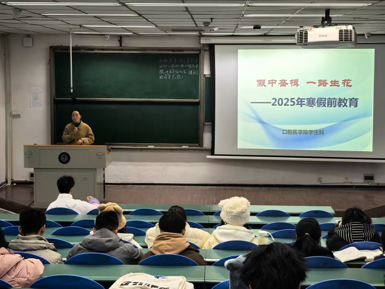 为增强学生假期安全防范意识,帮助同学们度过一个安全、充实、愉快的寒假,近日,口腔医学院顺利开展假期安全教育活动,各年级辅导员主讲,全体同学参加。