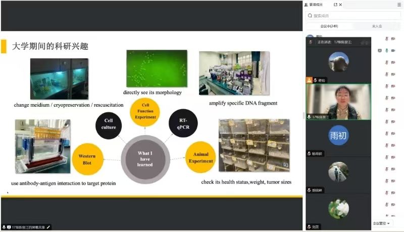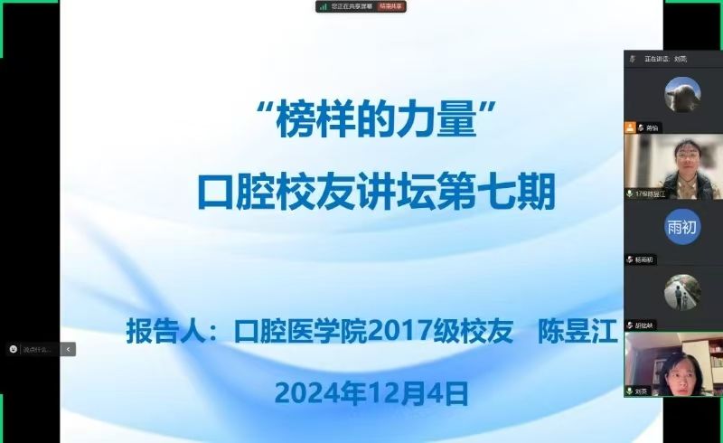 为引导学生合理地进行学业规划和职业生涯规划,切实发挥朋辈榜样示范作用,近日,口腔医学院开展第七期校友讲坛,2017级优秀校友陈昱江应邀主讲,口腔医学院院长刘英、学生科辅导员、口腔医学院全体同学通过线上参会。