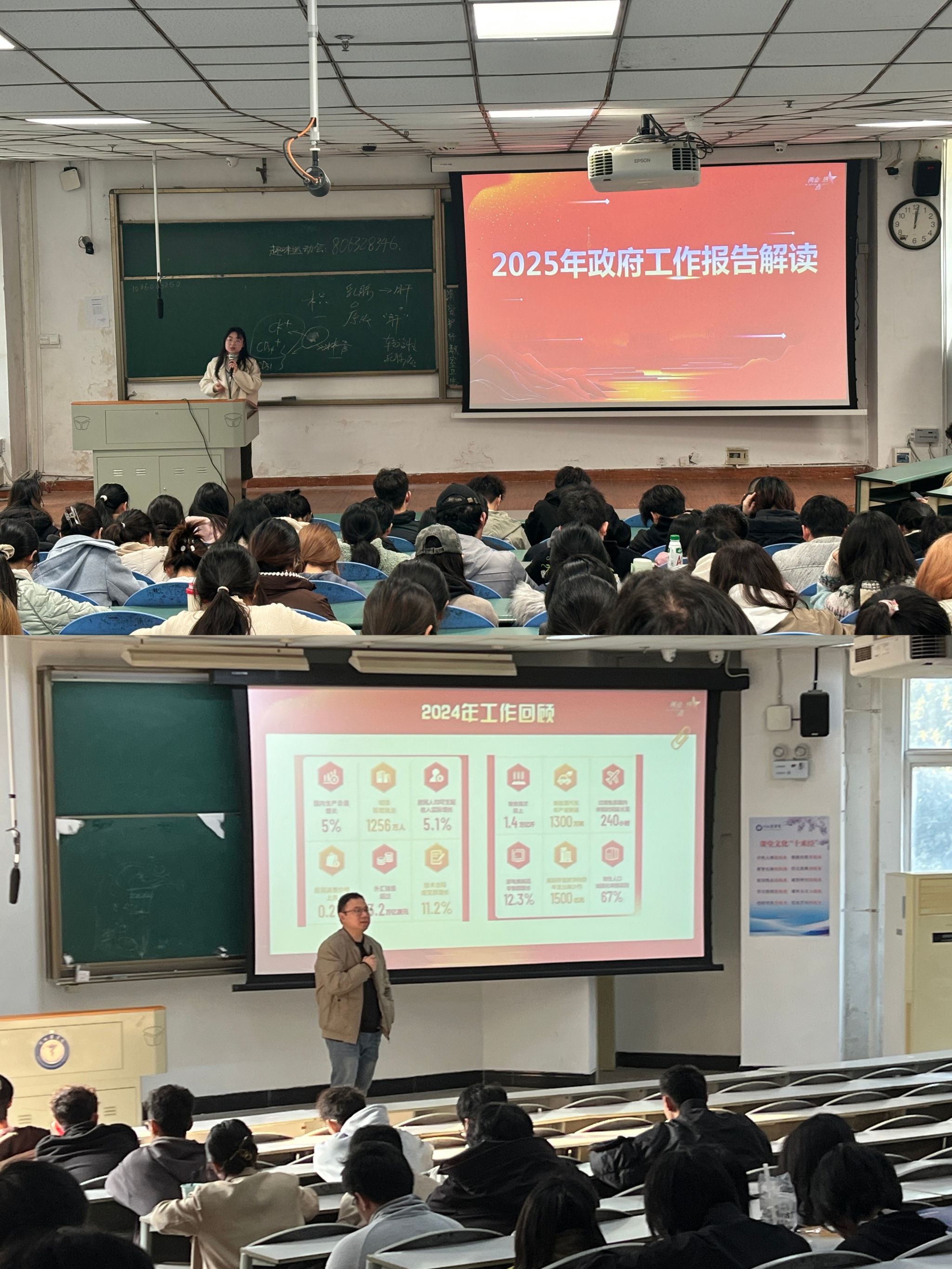 首先,辅导员介绍了2025年全国两会的基本概况,包括会议的重要议程、主要成果以及两会对于国家发展的重大意义。围绕《2025年国务院政府工作报告》,详细解读2024年工作回顾、2025年经济社会发展总体要求和政策取向、2025年政府工作十大任务,重点介绍报告中关于教育、就业和科技创新等方面的政策。鼓励同学们紧跟时代步伐,培养创新思维,提升自身能力,为国家科技进步贡献力量。同学们纷纷表示,积极将两会精神内化于心、外化于行,在今后的学习和生活中,积极践行两会精神,努力成长为有理想、敢担当、能吃苦、肯奋斗的新时代好青年,为实现中华民族伟大复兴的中国梦贡献自己的青春力量。