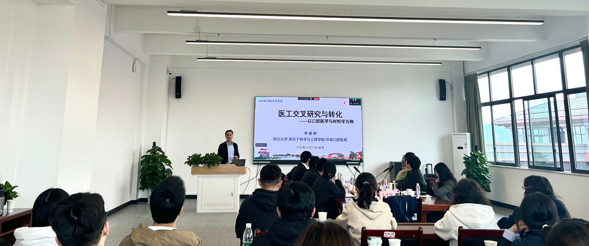 为深化医工交叉融合、推动创新成果转化,11月13日,口腔医学院特邀国家杰出青年科学基金获得者、四川大学高分子科学与工程学院医用高分子材料系专家李建树教授来院,开展题为《医工交叉研究与转化——以口腔医学与材料学为例》的专题学术讲座,并同步举行博士座谈交流会。活动由学院副院长唐婉容主持,学院博士生、师生代表共同参与,围绕跨界创新展开深入交流。