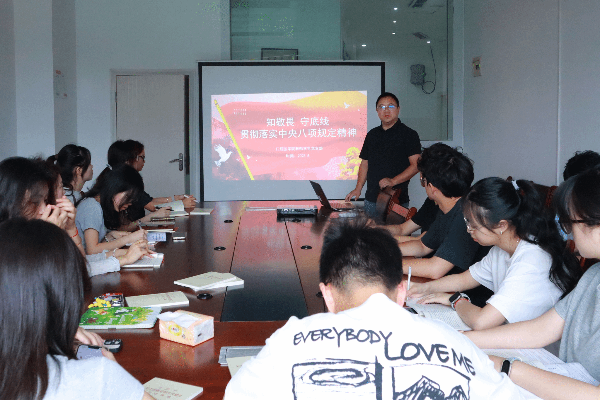 为扎实推进中央八项规定精神学习教育,强化党员纪律意识和作风建设,5月30日上午,口腔医学院教师学生党支部在学院会议室组织开展了“知敬畏,守底线,贯彻落实中央八项规定精神”学习教育专题党课。党支部书记冯延章任主讲,全体党员参加。