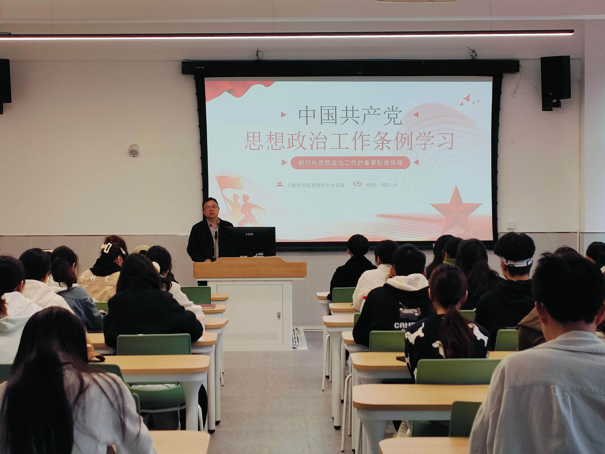 为进一步加强和改进思想政治工作,2025年10月29日,口腔医学院教师学生党支部在学院会议室举行专题党课,支部书记冯延章为支部全体党员及入党积极分子讲授题为“中国共产党思想政治工作条例学习——新时代思想政治工作的制度保障”的专题党课。