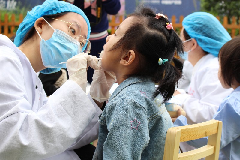 在充满乐趣的互动环节结束后,川北医学院口腔医学系的志愿者们为小朋友们进行免费涂氟防龋,并根据实际情况为小朋友的日常习惯提出护齿建议,例如正确按时刷牙、少糖少油等。