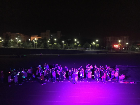 本次活动分设跑步打卡和荧光夜跑两个环节。跑步打卡是同学们从13号晚上开始在足球场跑步,看谁能坚持不懈。荧光夜跑活动是18号晚上7:30在新区足球场举行的创意体育活动。同学们拿着荧光棒、戴上牛角灯、荧光圈、奔跑在学院的足球场上。在跑步过程中,伴随着动感的音乐,通过一个个独具匠心的障碍关卡——吃柠檬,倒跑,蛙跳,抢位赛等让同学们热情高涨,整个体育活动充满着欢快与青春气息。