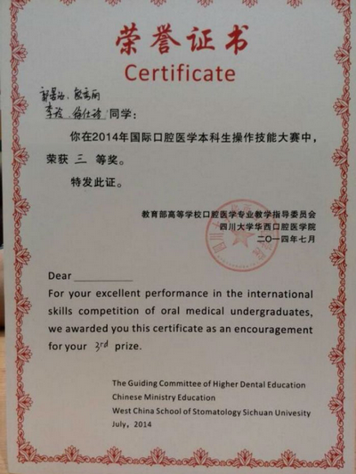 07月09日,2014年首届国际口腔医学本科生操作技能大赛在四川大学华西口腔医学院举行,来自海内外近40所大学的100余名选手参加了此次比赛,我校口腔医学系郭晏汝等四名同学组成的川北医学院口腔医学系代表队参赛并荣获三等奖。