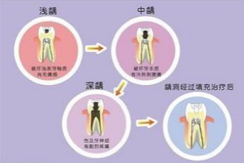 龋齿实际上是某些细菌利用口腔里残留的糖分制造出酸,进而腐蚀牙齿所致,如果不加以治疗,龋齿里的细菌会持续破坏牙齿,不断繁殖,产生毒素。细菌和毒素进入到牙髓后,会发展成牙髓炎和根尖周炎,造成剧烈疼痛。慢性炎症虽然没有剧烈的疼痛,但细菌会破坏牙根尖区域的牙槽骨,穿通牙龈,形成瘘管。