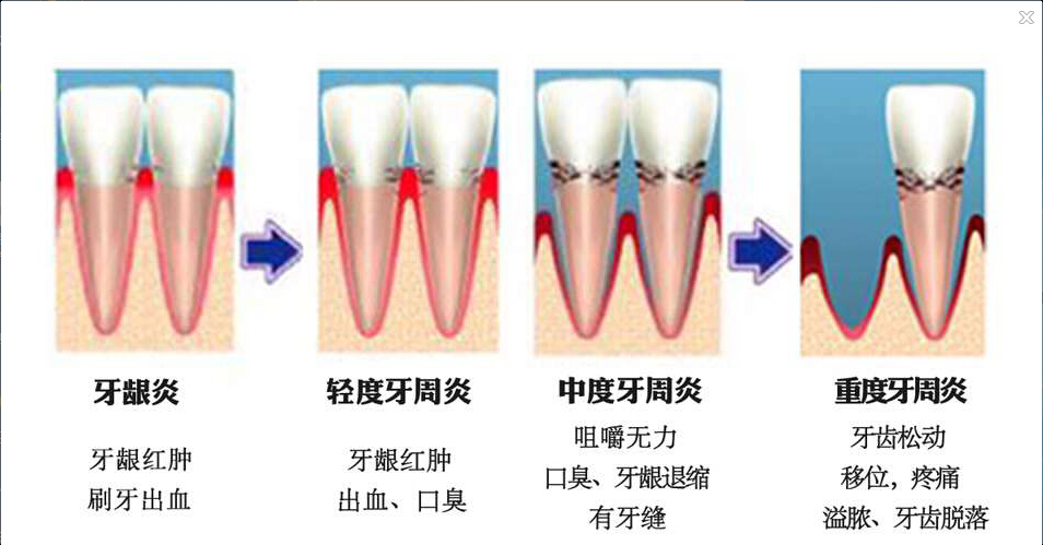 3.牙齿有不同程度的松动,牙根暴露或牙龈红肿、有脓,说明已发展到牙周炎;