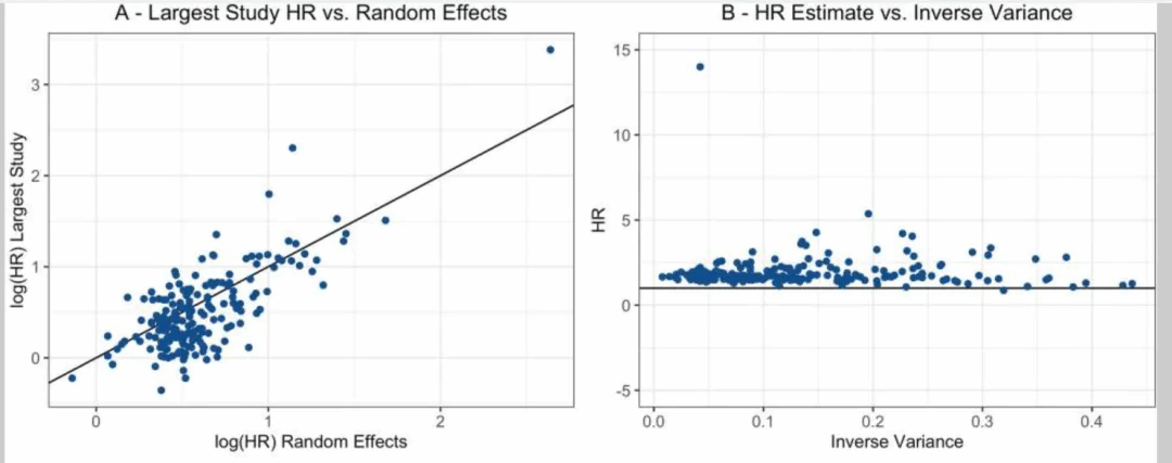 相反。最大成分研究的效应量估计往往比随机效应估计更保守,136 项荟萃分析 (67%) 产生的 HR